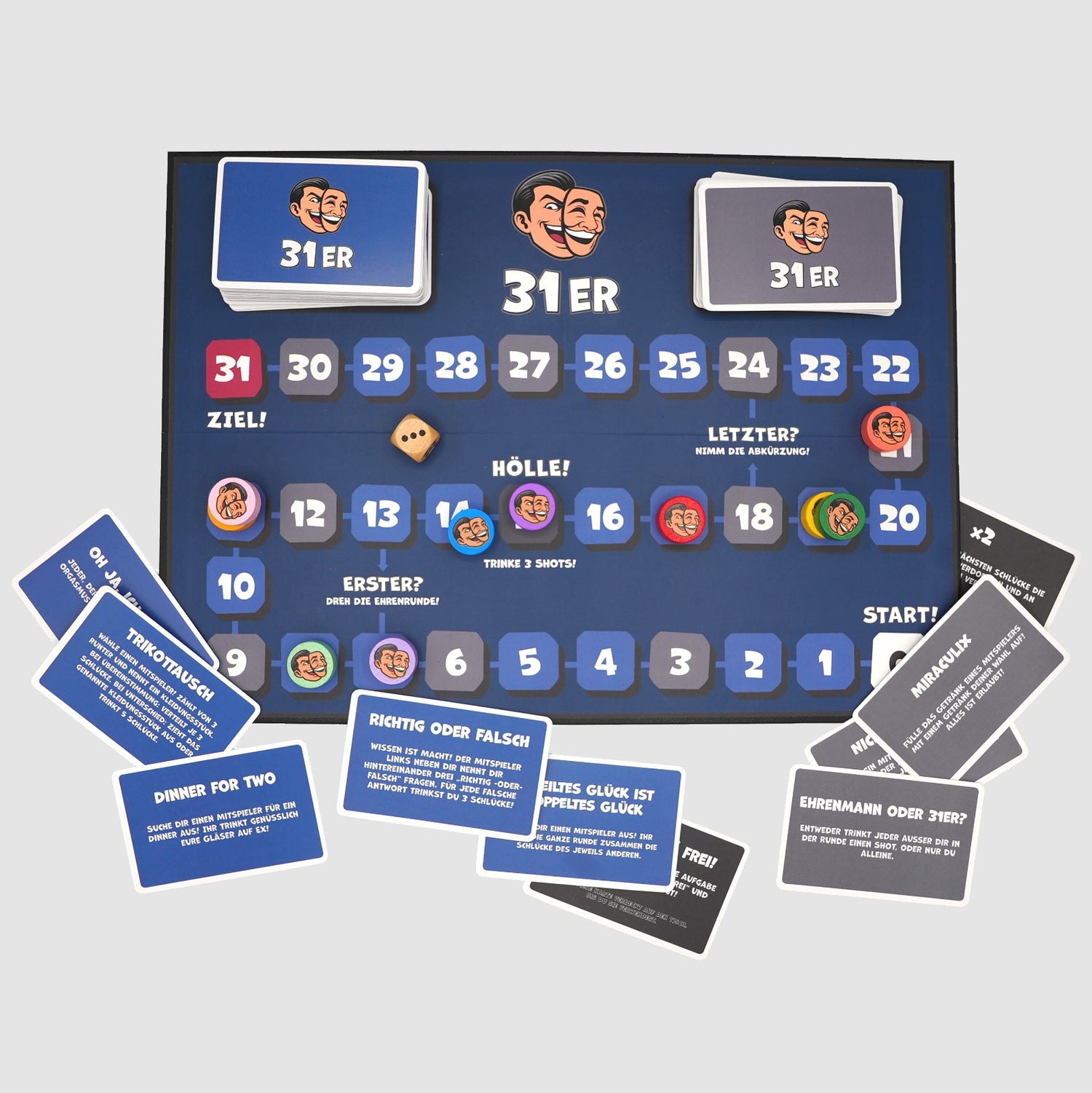 Das Spiel umfasst insgesamt 150 Karten – darunter 100 blaue Normale Karten und 50 graue 31er-Karten.